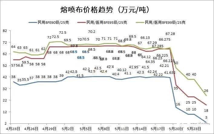 自5月18日起,熔噴布市場出現(xiàn)了深度的兩極分化。一邊是符合出口口罩要求的熔噴布極度缺乏,市場上基本看不到,導(dǎo)致80%的口罩廠停工;一邊是所謂的“95+”布價(jià)格崩盤,從月初的70W一噸狂跌到20W以下仍無人問津。