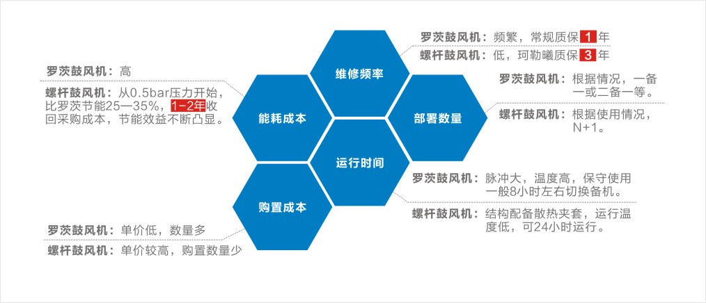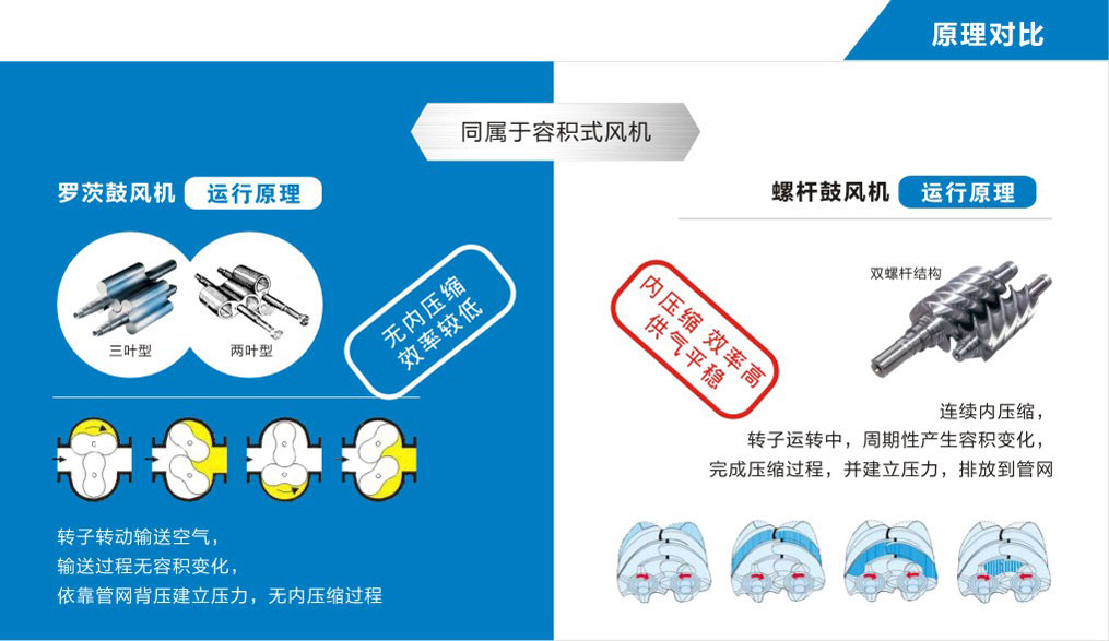 羅茨風(fēng)機(jī)和螺桿鼓風(fēng)機(jī)都是屬于容積式風(fēng)機(jī),如果兩者要進(jìn)行比較的話,可以簡單歸結(jié)為壓縮原理的不同,螺桿鼓風(fēng)機(jī)的節(jié)能、穩(wěn)定、低噪優(yōu)勢更為突出。