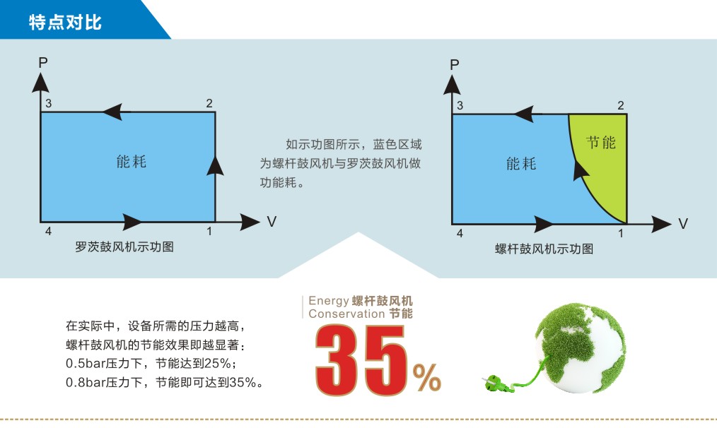 雙螺桿鼓風(fēng)機(jī)是傳統(tǒng)羅茨和螺桿機(jī)型的衍伸機(jī)型,具有傳統(tǒng)羅茨風(fēng)機(jī)強(qiáng)制送風(fēng)的特點(diǎn),螺桿式機(jī)型具有一定自壓縮,通過過量吸入達(dá)到超高的容積效率,雙螺桿鼓風(fēng)機(jī)采用的內(nèi)壓縮所需功耗要遠(yuǎn)遠(yuǎn)低于羅茨鼓風(fēng)機(jī)采用的外壓縮,而且內(nèi)壓縮過程是連續(xù)漸進(jìn)的,氣流脈動要低于羅茨鼓風(fēng)機(jī),所以螺桿鼓風(fēng)機(jī)的噪音及穩(wěn)定性也均優(yōu)于羅茨鼓風(fēng)機(jī)。不啰嗦了,用圖說話。
