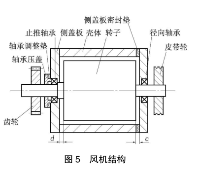 用塞尺法檢測轉子端面與機殼的軸向間隙。定位端( 齒輪側)間隙d=0.1~0.2 mm,非定位端( 皮帶輪側)間隙c=0.3~0.5 mm,總間隙的標準是 0.4~0.7mm。