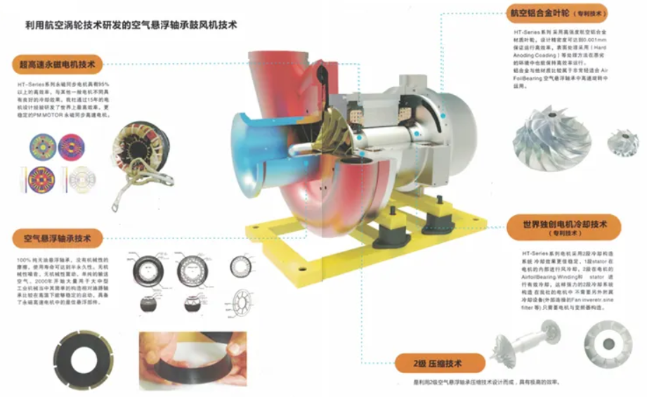 空氣懸浮離心鼓風機是一種全新概念的離心鼓風機,借鑒航空、航天器的渦輪發動機,應用先進的空氣懸浮技術,采用了“高效永磁電機”和“空氣懸浮軸承”這兩個高端核心技術,改善了傳統單級高速渦輪鼓風機的轉速齒輪、聯軸器、冷卻系統和油潤滑系統等,大大提高了產品的技術性能及運行可靠性。避免了噪音、振動以及廢棄潤滑油等對環境造成的二次污染,大大減少了設備維護工作量,節約了設備維護成本。